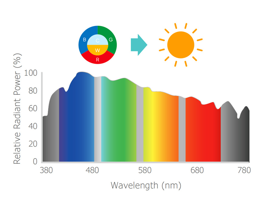 從日出到日落全過程的光譜, 色溫, 亮度等符合自然的效果